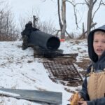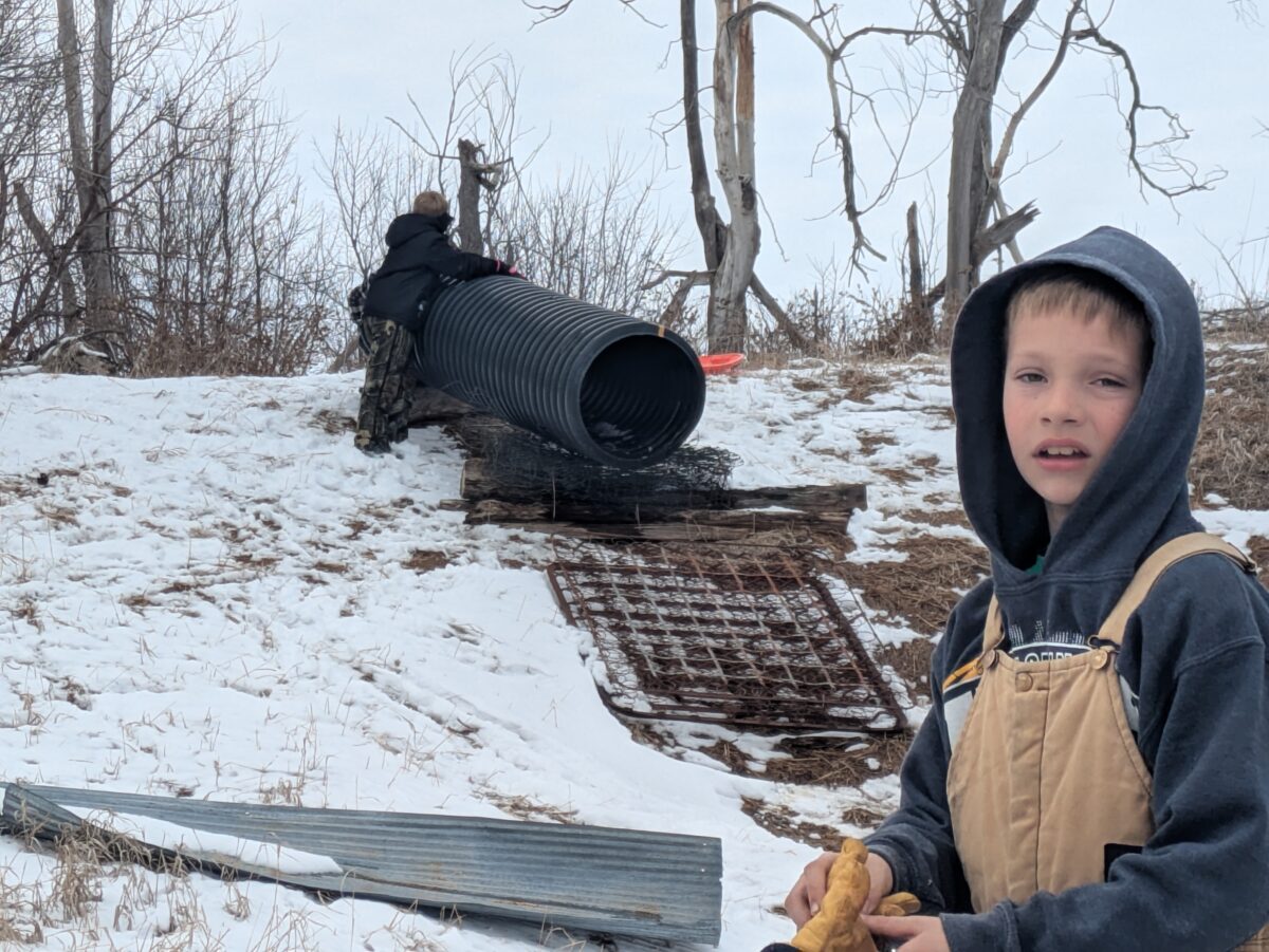 Once the cold snap finally broke Gus got busy and built himself a go cart. Not one with a motor, but one that rolled nicely down hills. He used whatever materials he could find laying around the junk pile. Then not wanting his creative spell to be broken, he designed the sledding contraption. A big plastic culvert got rolled up on blocks, then an old mattress spring, another junk pile find was placed under the end of the tube. It’s a wonder no one has broken any arms playing on these wonderful toys.