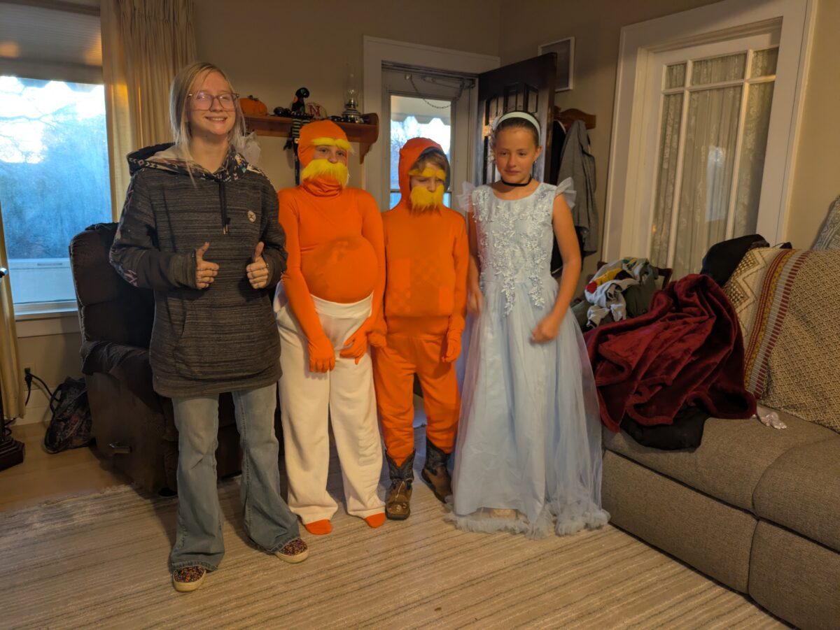 For Halloween the kids came home informing us of their plans for the night. Guess they’re getting all grown up. Gus had group costumes planned with his friends. Elly is too cool to dress up so she went as a teenager. But she went right along with them and happily hasn’t decided to give up trick or treating yet.